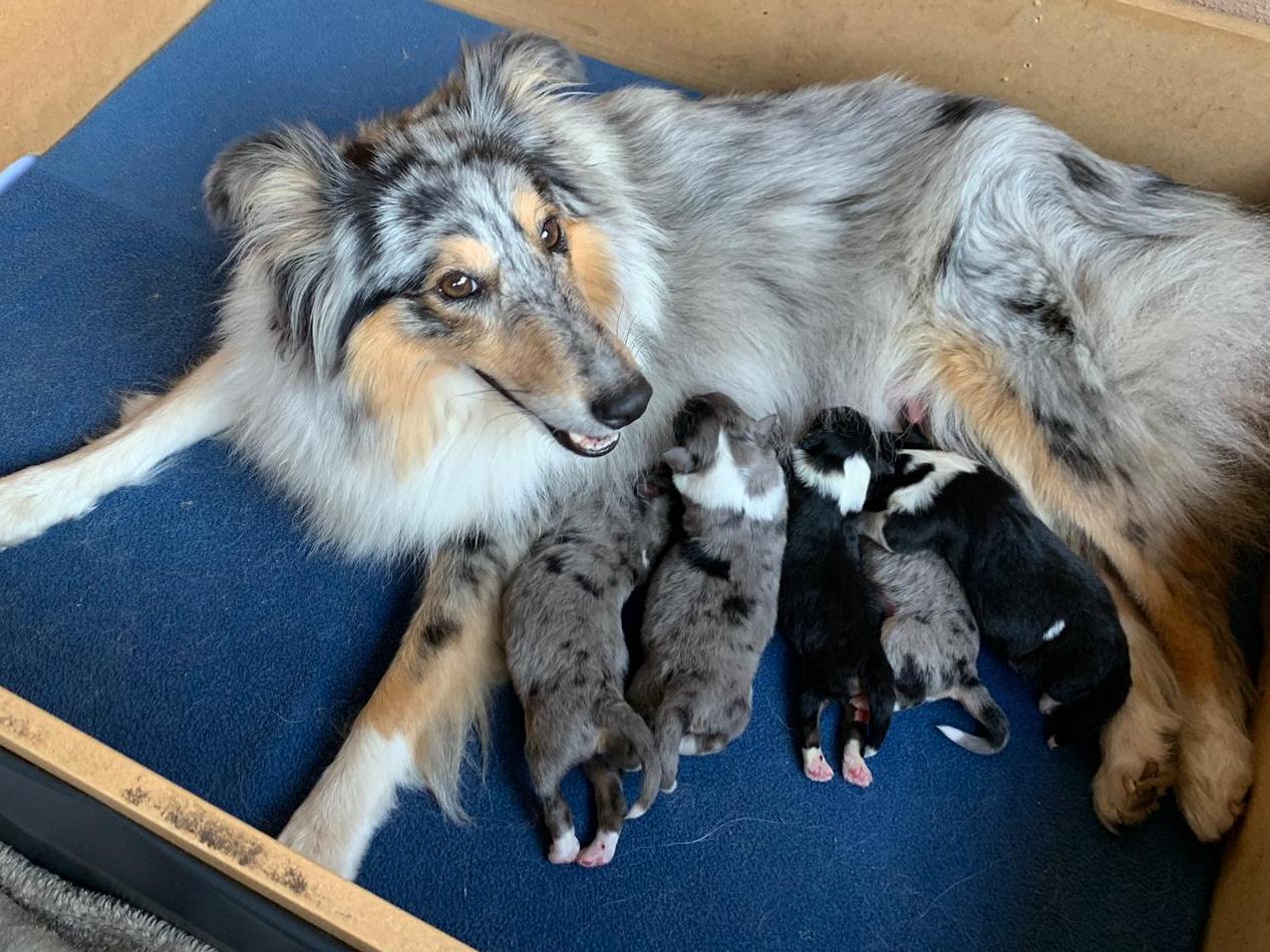 Fay heeft 5 pups gekregen, 1 blue merle teefje, 2 blue merle reutjes en 2 tricolorreutjes.